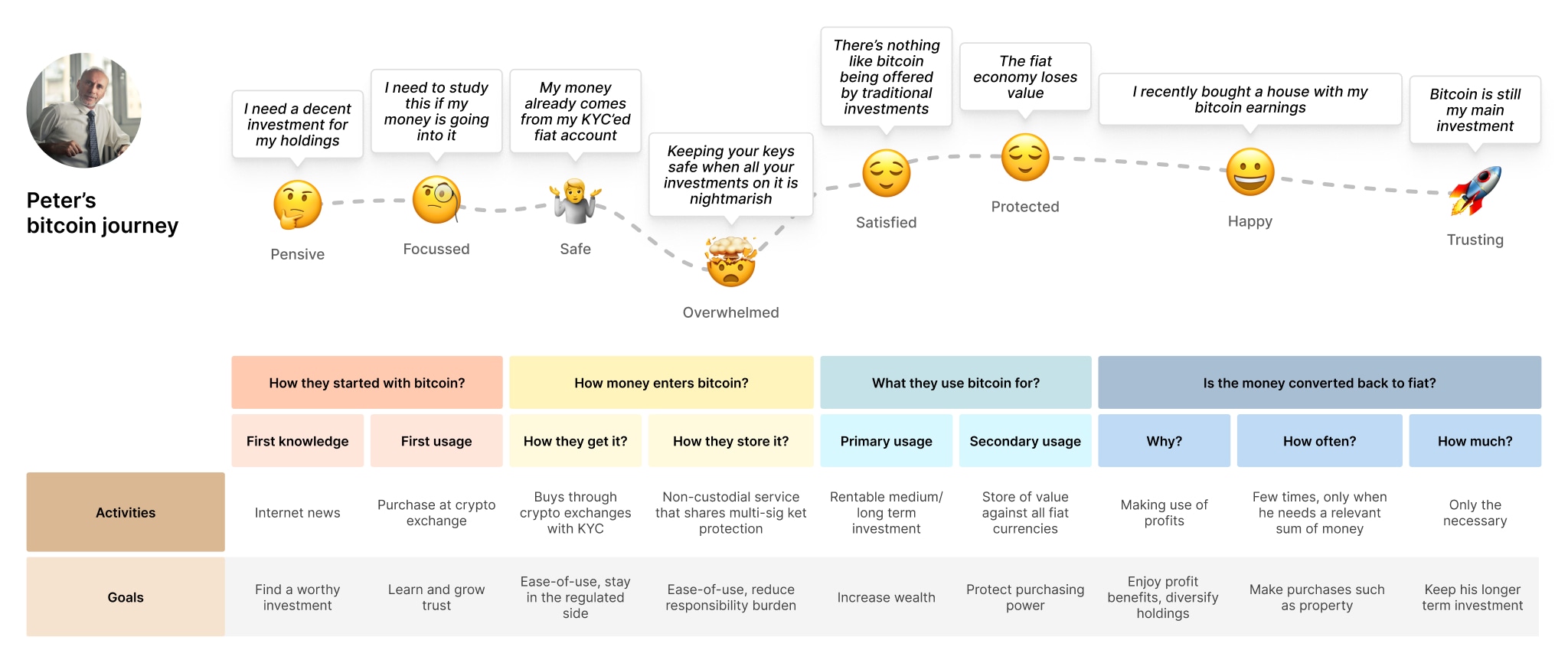 Patrícia Estevão developed several personas of bitcoin users based on 1-1 interview sessions. You can read about her full process here. These personas can be a great inspiration and foundation for your own work. Here we provide short summaries for you to get started with.